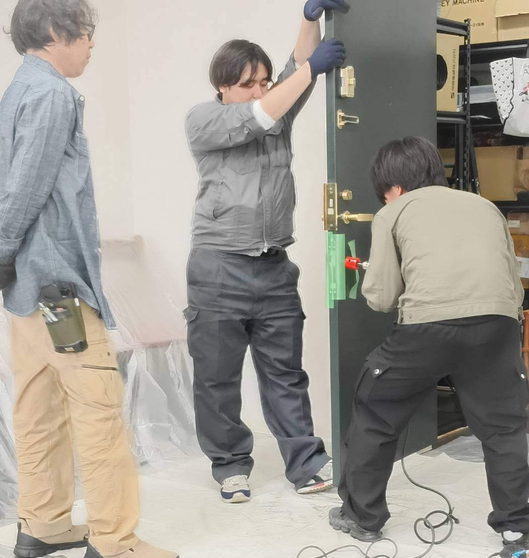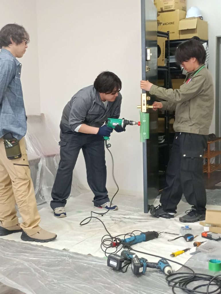 以前いただいた古い鉄扉に穴あけして補助錠、錠ケースの切欠き加工などを指導しました♬
